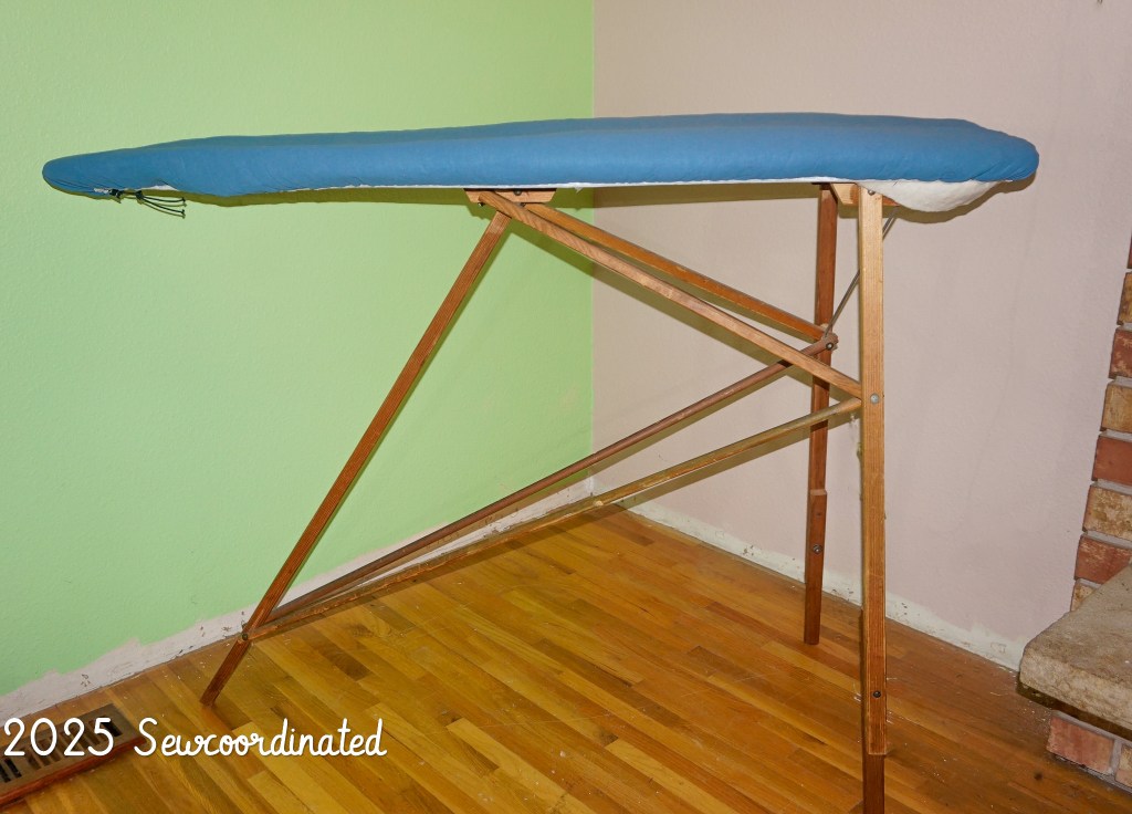What are the standards for replacing an ironing board cover? I recently read that it should be replaced every 3 years if used daily. I use mine mostly for sewing: ironing fabrics before cutting, and pressing garments during construction. It’s used occasionally for ironing of store bought clothing as well. In the 11 years since I made the last cover (see original post), it’s held up pretty well, but it had accumulated some battle scars. Fusible interfacing glue got on it while fusing pattern pieces, and I accidentally cut through it a couple times while clipping or trimming. I end up using it as a work table at times while I’m making things! And hey, it’s been 11 years, what can I expect? Of course it’s time for a new cover. Last time I made my own. It was made from silver utility fabric that I bought from Joann’s. I wanted to make my own cover again, but I wanted better fabric this time. I had a standard in my mind that if I was going to sew my own, then it had to be quilted silver heat resistant fabric. Unfortunately, that fabric got sold out at Joann’s because they were going out of business, as everyone knows by now. I didn’t want to settle for the same fabric I used last time. Nor did I want to quilt my own, because I don’t have the set up to quilt a piece that large. With those things in mind, I made the decision to buy a cover. I chose a cover by Tivit and bought it on Amazon. I chose it specifically because it has a bungee cord to adjust the fit of the cover, in addition to the Velcro straps that many commercially made covers now have. My board has a sizing that’s a bit smaller than some modern boards, so a cover that can adjust to the odd size is very important. It got good reviews from people who have a vintage wooden board, and that gave me confidence in it. I first placed cotton batting onto the board to fill in the warped area. I didn’t do that last time, but this time I thought why not, and it did help level out the warping to a straighter line of board: