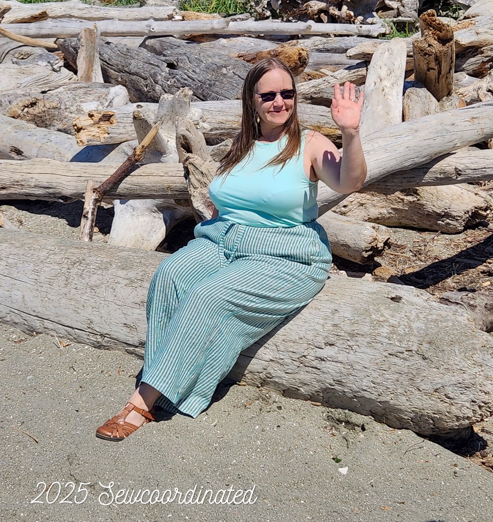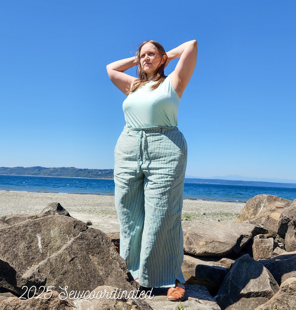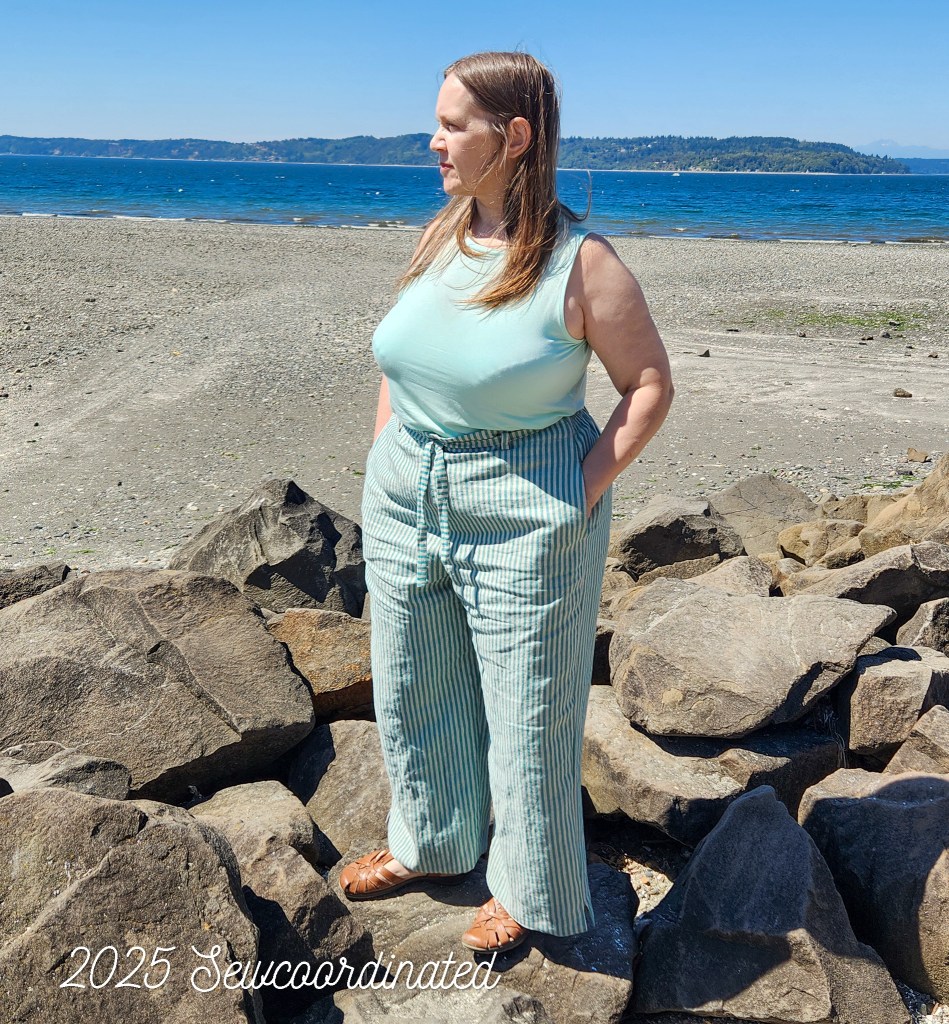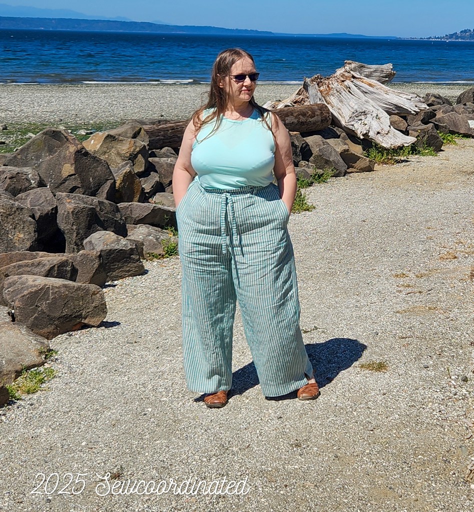 I think these are perfect for summer finished in linen this way. As of this writing though, I’ve decided to shorten the hem even further. Why? Well, since I altered the pattern more after making the muslin, the pants became a bit bigger. As a result, there’s more flare in the leg than there was in the muslin. I thought at first I liked them with the long hem, but now I think the length is too long. Other factors that affect the hang include: heavy items carried in the front pockets, such as my phone. Remember that this fabric is linen, and will sag when weighed down, which can change the hang of the hem. I also placed more faith in the belt’s ability to help hold the pants up than I should’ve. The tension it actually does provide has a limit. It can be pulled more tightly, but if I pull it too tight then it slides above the belt loops. This tells me that it was meant more as a design element.