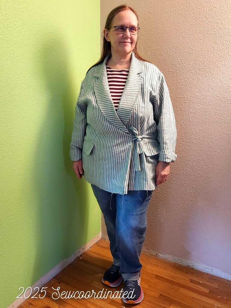 The blazer turned out too big in the shoulders and arms. It fits me better in the lower half of the jacket. I plan to alter it to fit me better in the upper half, but I took some pics to document how it looked on my first try before I make alterations: