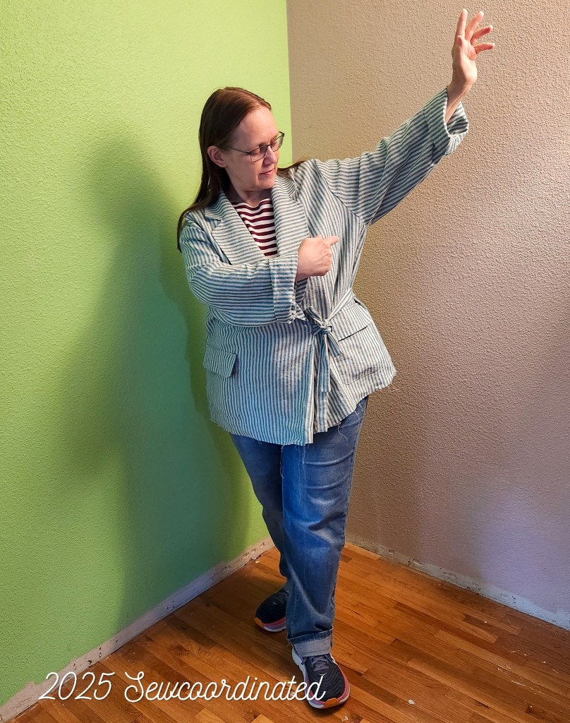 There is no way to adjust the length of the jacket fronts on this particular pattern. Collar, pocket, pocket flap and tie placement make it too complicated to adjust the length. The sleeves have length adjustment, which I did use. I shortened the sleeves by a 1/2″ (1 cm). This is a standard adjustment I make, as pattern sleeve lengths are usually too long for me. The sleeves were still long on the finished jacket, even with the adjustment.