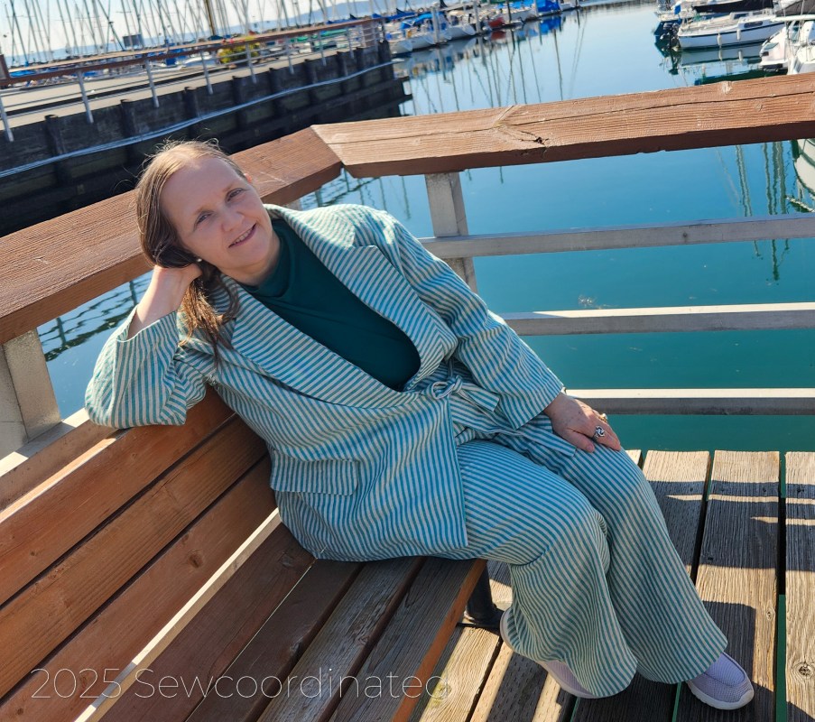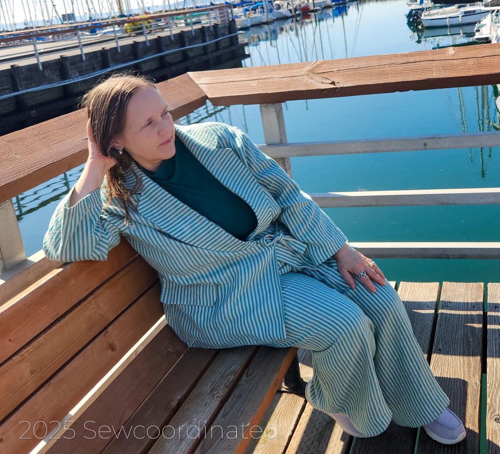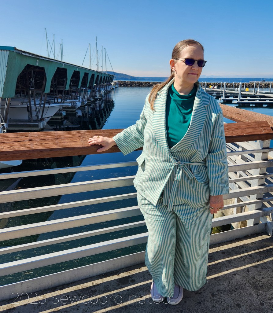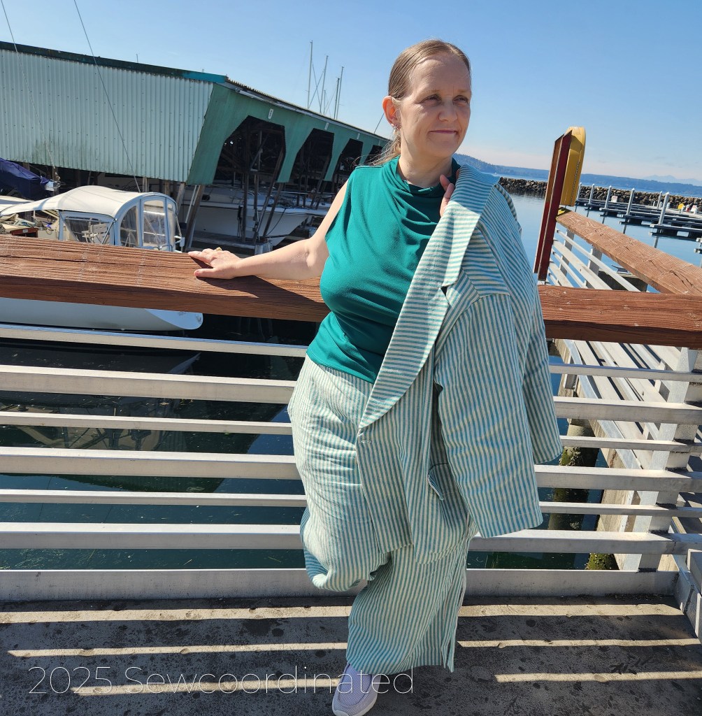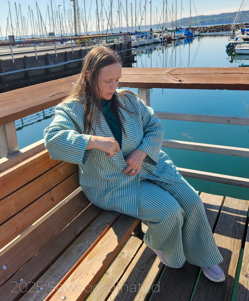 After re-making the blazer, S9714 by Mimi G, I was finally able to take some pictures of the completed look. My suit is made up of 2 different patterns, from 2 different time eras: S9714, the blazer, is a modern pattern, published in 2023 and Vogue 1986, the pants, is an OOP vintage pattern from 1997. V1986 is by designer Isaac Mizrahi, and was published as part of the Vogue Attitudes collection. Interestingly, both these patterns are suits, but I chose to take 1 piece from each. I’d already made the pants once before, so I had experience with sewing them. The S9714 pants had a zipper fly, which I didn’t want at the time. I wanted a more casual pair of pants for summer.